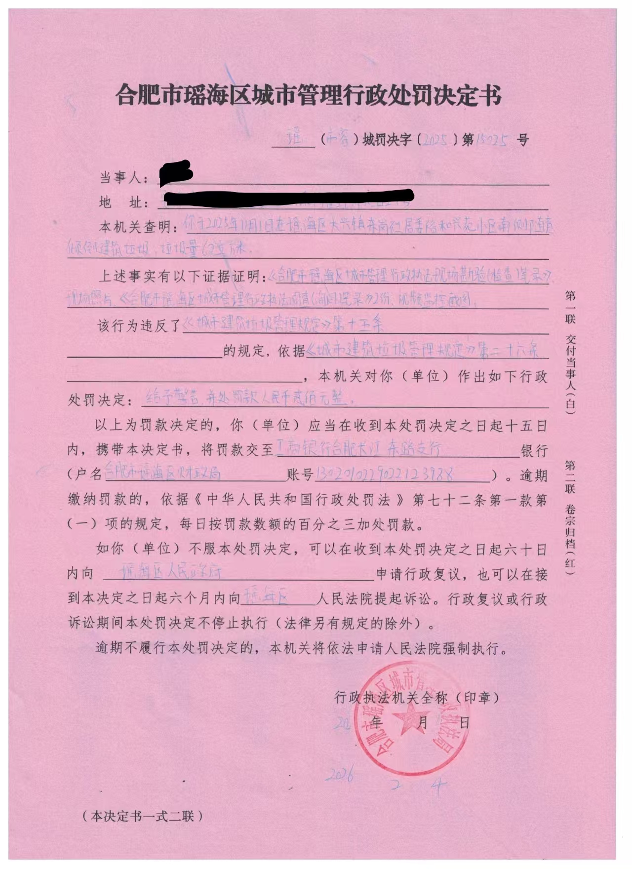 瑶海区城市管理局2026年2月份行政处罚文书 |