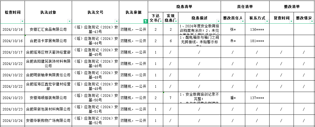 瑶海区应急管理局2024年度10月安全生产“双随机、一公开”联合执法抽查情况 |