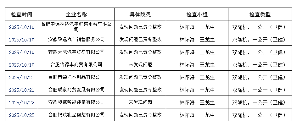 瑶海区应急管理局2025年度10月安全生产“双随机、一公开”联合执法抽查情况 |