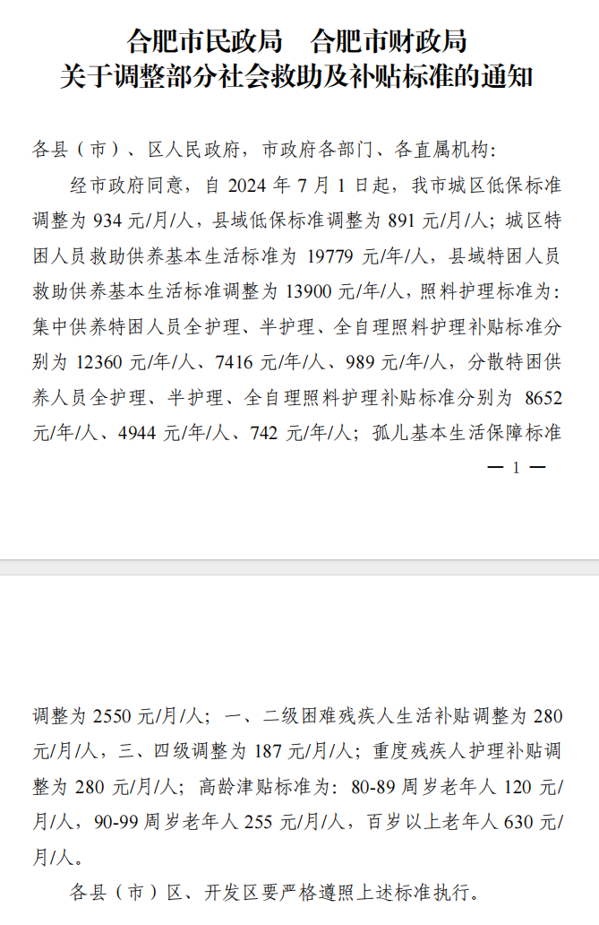 关于调整部分社会救助及补贴标准的通知(合民〔2024〕75号) |