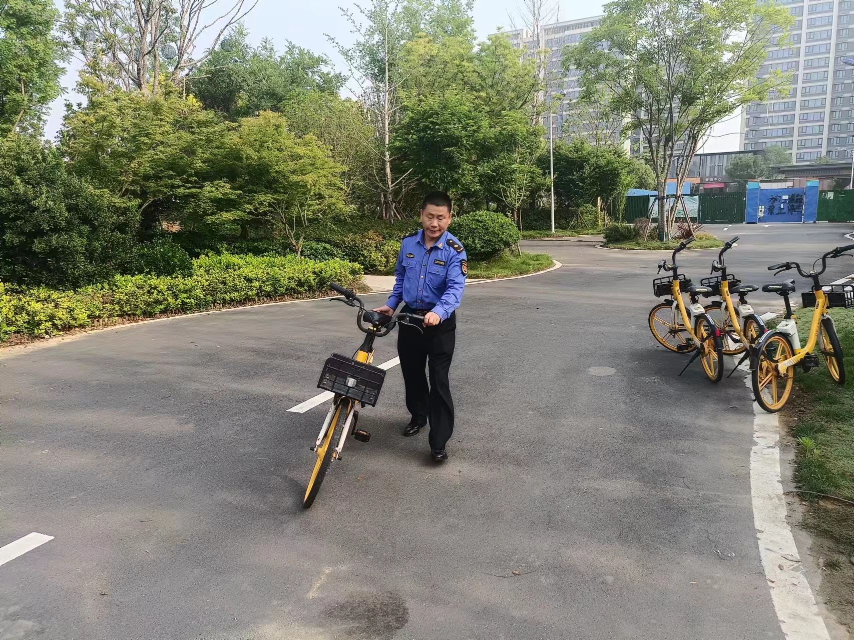 城管队员对违规停放的共享单车进行整理,并督促单车企业做好基础清运规范工作,优化通行环境。同时重点对商圈、学校周边等区域采取边宣传、边督促、边整治的方式,引导大家规范停放共享单车,共同维护良好的城市秩序。