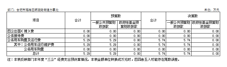 2020年度一般公共预算及政府性基金财政拨款“三公”经费支出决算中,因公出国(境)费支出决算0万元,占0%;公务接待费支出决算0万元,占0%;公务用车购置及运行维护费支出决算5.74万元,占100%。具体情况如下: