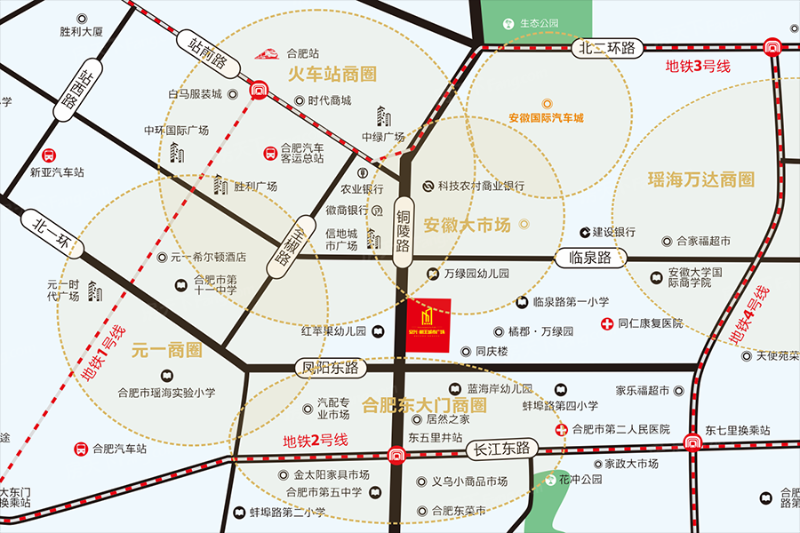 项目周边汇集有火车站、元一、瑶海万达、大东门、安徽大市场等五大商圈,满足商务宴请、休闲购物等多种商务及生活需求,为入驻企业创造商务价值,提供增值服务。