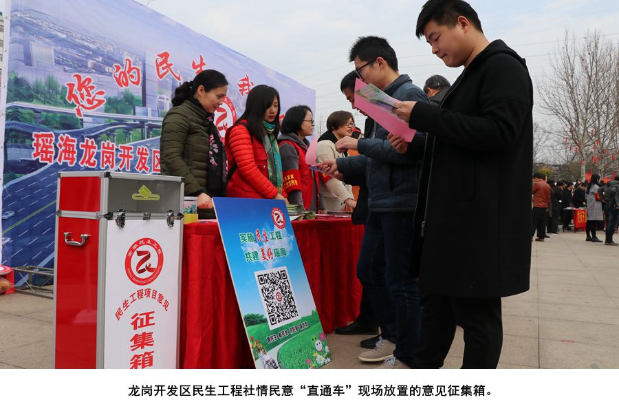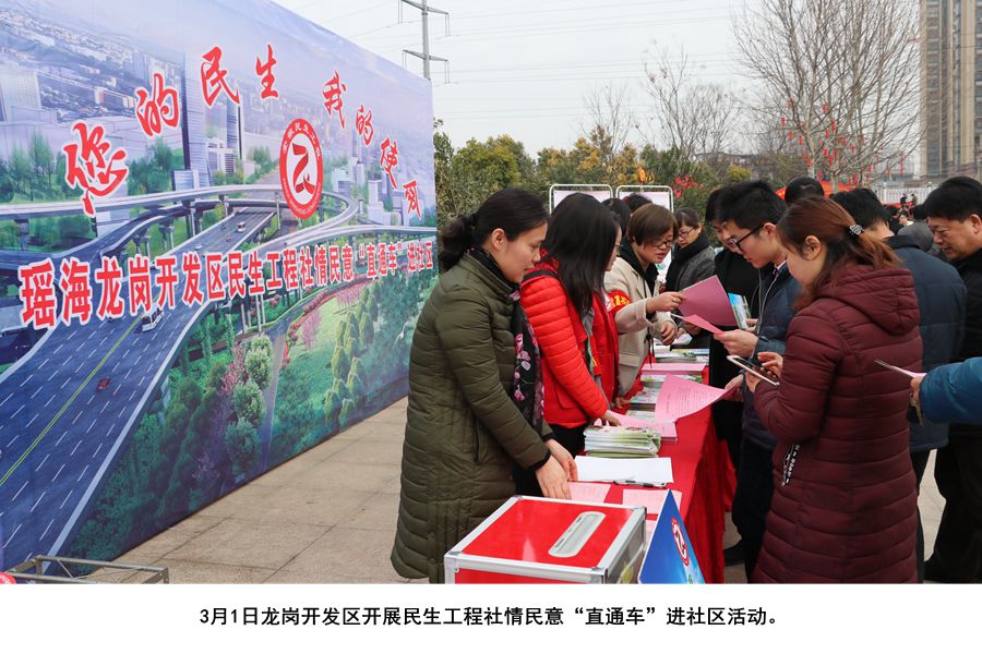 2018年3月1日,龙岗开发区在辖区龙岗游园开展了一场名为“您的民生,我的使命”民生工程社情民意直通车系列活动。活动现场摆放民生政策宣传展板,设置有社情民意“征集意见箱”广泛征求意见,现场14位民生工程宣传包保责任人发放民生工程宣传册,采取主动贴近群众,精准对接服务人群和民生工程受益对象方式,现场倾听、收集群众真实呼声,接受社会监督。