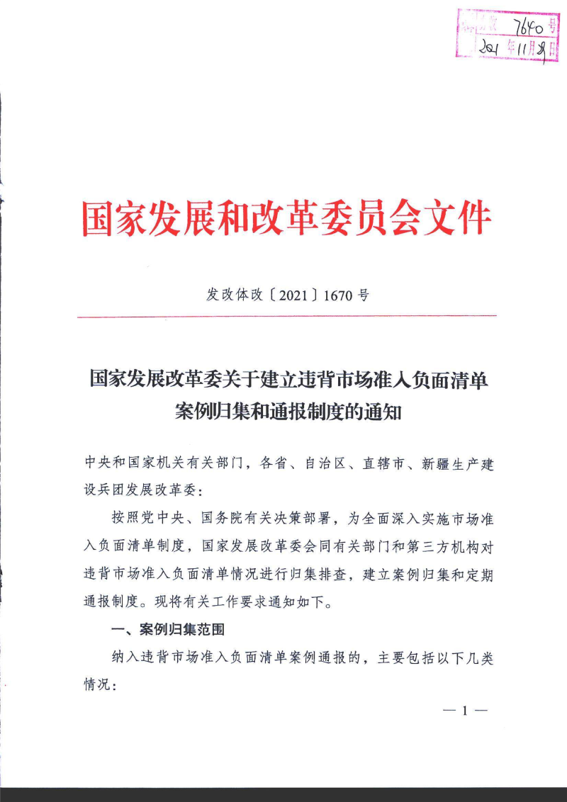 国家发展改革委关于建立违背市场准入负面清单案例归集和通报制度的通知