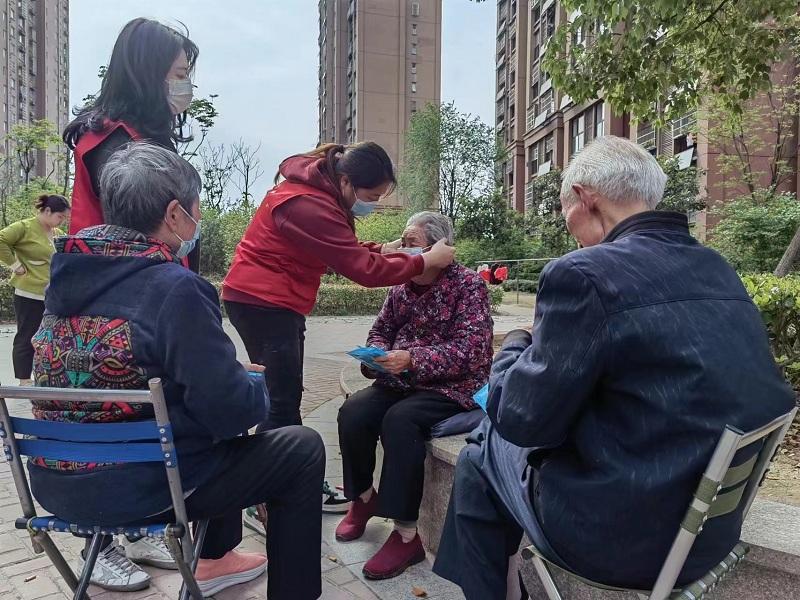 活动中,志愿者们来到辖区内向老人们讲述疫情防控最重要的措施就是佩戴口罩,告诉老人们口罩的正确佩戴方法并手把手教老人们如何佩戴,同时叮嘱老人们在疫情防控期间少出门、勤洗手,注意自身防护,保持乐观健康心态,树立生活信心,用坚定的理念共同战胜疫情。