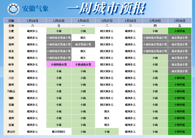 30日(周五):全省阴天。沿淮淮河以北和大别山区有雨夹雪或小雪,局部中雪;其他地区有小到中雨。