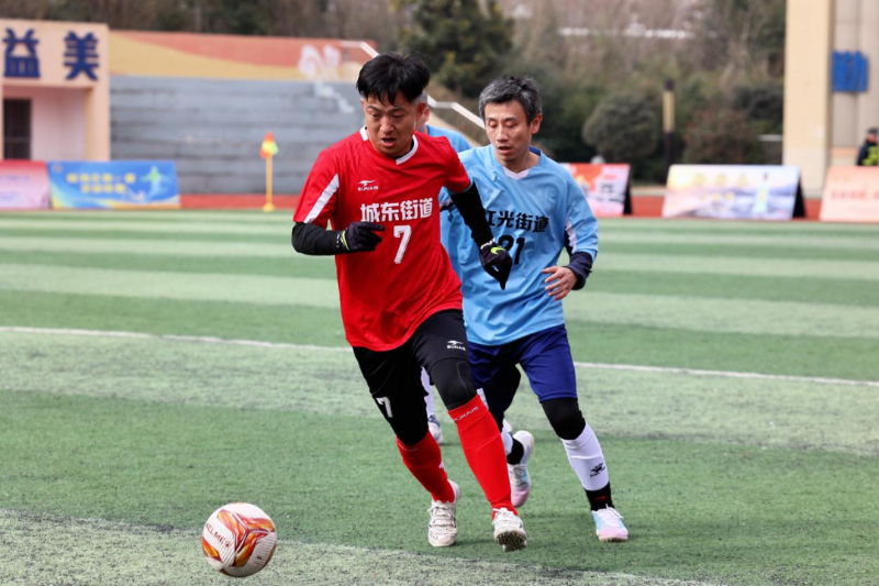 在第三场城东街道与红光街道的对决中,红光街道展现出“老带新、新促老”的强劲战斗力,城东街道年轻球员的强烈冲击力同样不容小觑。“拖住他”“补一个”……场外两方教练嘶吼的指导声,与观众席此起彼伏的“好球”呐喊、助威号角声交织,点燃了整个赛场。然而,红光街道快节奏的攻防转换让城东街道难以招架,尤其是率先破门后红光街道攻势愈发猛烈,最终以4:0的成绩强势锁定四强席位。