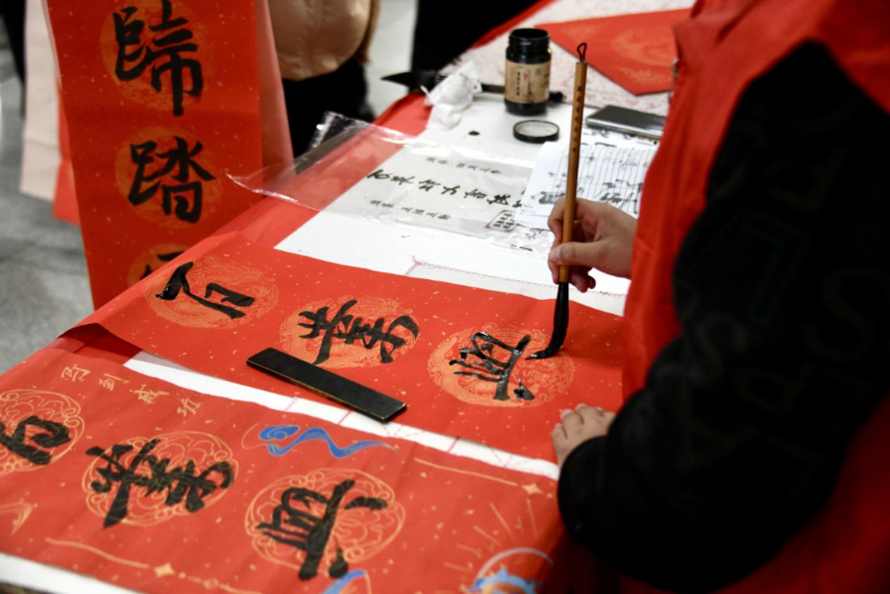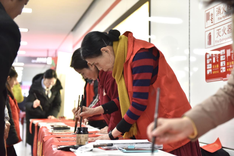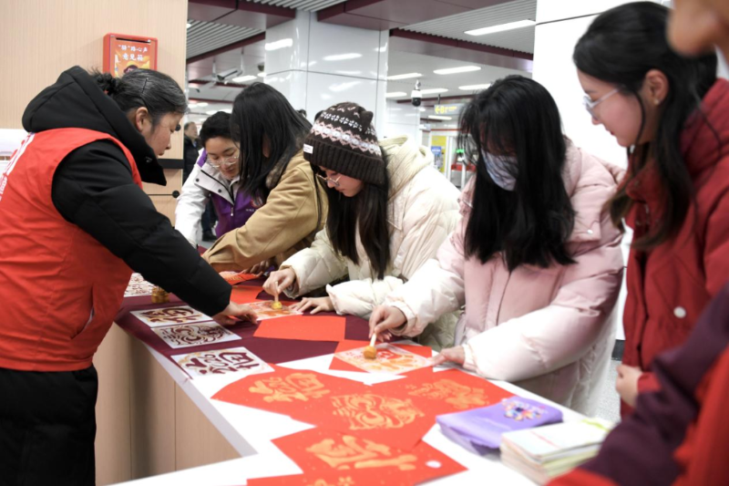 在合肥火车站地铁站,暖意同样涌动。瑶海区妇联联合区委宣传部、火车站综管办、区文化馆及合肥轨道公司等多家单位,温情启动“暖途相伴,让爱回家”春节共建活动。活动现场布置精巧,精心打造的新春寄语打卡墙吸引不少旅客驻足留影,一旁的志愿者为旅客送上定制红包与窗花,传递新春祝福。“福运带回家·年味伴旅途”环节更是人气爆棚——书法志愿者挥毫泼墨,一幅幅饱含“阖家团圆”“一路平安”等美好寓意的春联、福字新鲜出炉,免费赠予旅客;简易有趣的福字拓印区前,大人孩子齐动手,在亲手操作中感受传统民俗的独特魅力。